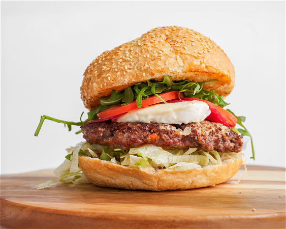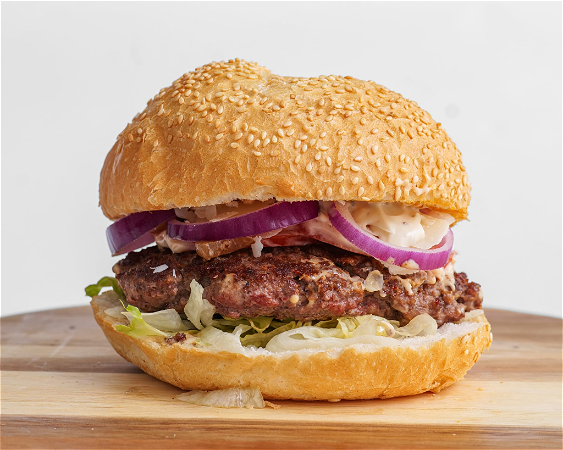 - Huisgemaakte black angus beef burger van 200 gram met broodje.